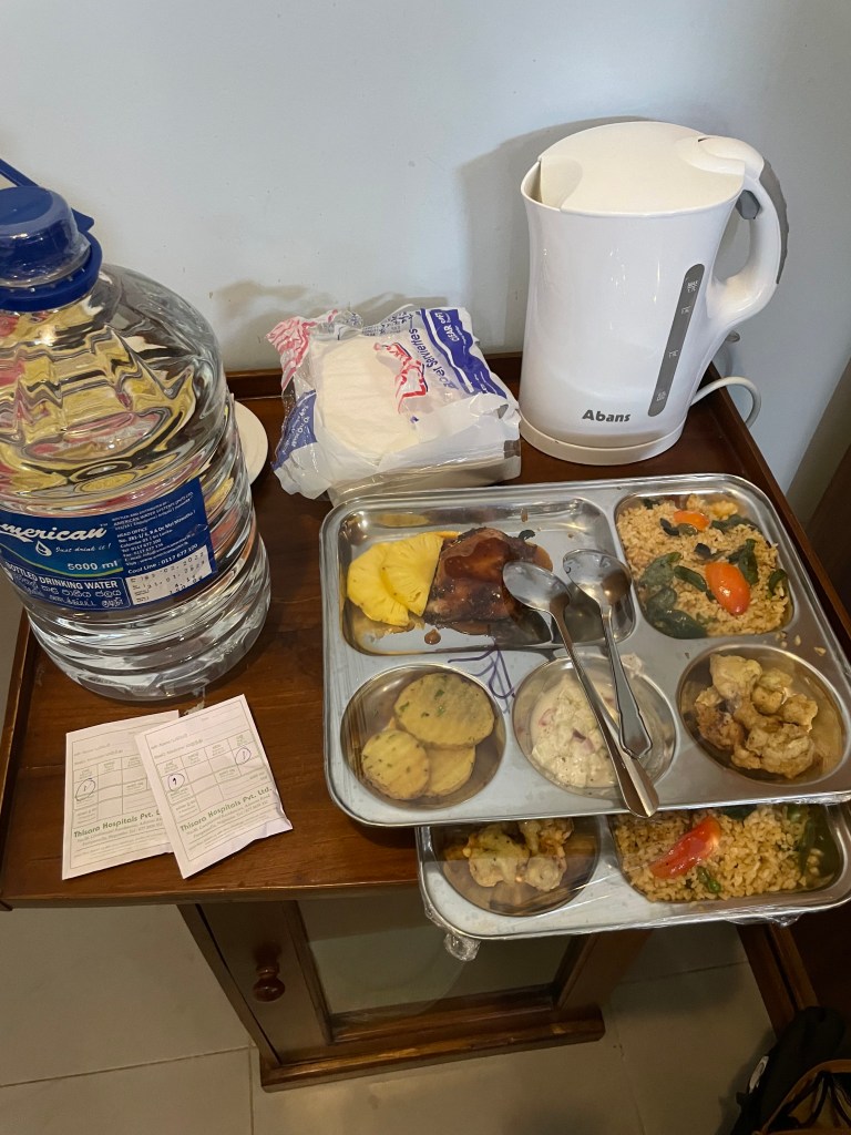 7 Tage hatte jeder von uns beiden EINE Plastikgabel, EINEN Löffel und EIN GEMEINSAMES Messer. Wir bekamen einen 10l Wasserkanister und über frische Gläser oder Kaffeetassen brauchen wir gar nicht erst einmal sprechen. Da wir einen Wasserkocher im Zimmer hatten konnte ich mit unserem restlichen Duschgel zumindest hier das Geschirr und Besteck ein wenig „reinigen“ denn Geschirrspülmittel, Desinfektionsmittel oder Seife werden wohl in einem Quarantänehotel überbewertet.