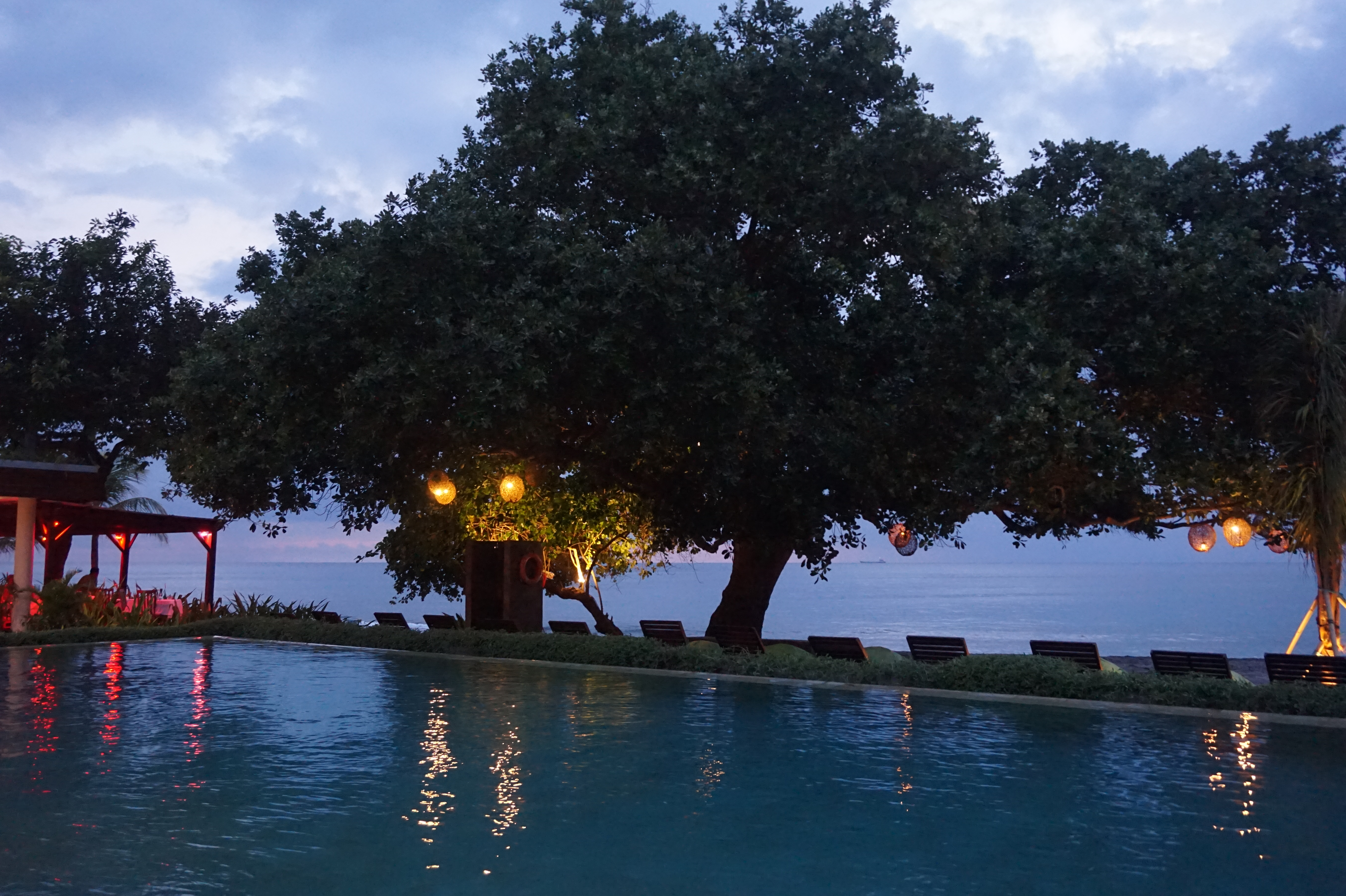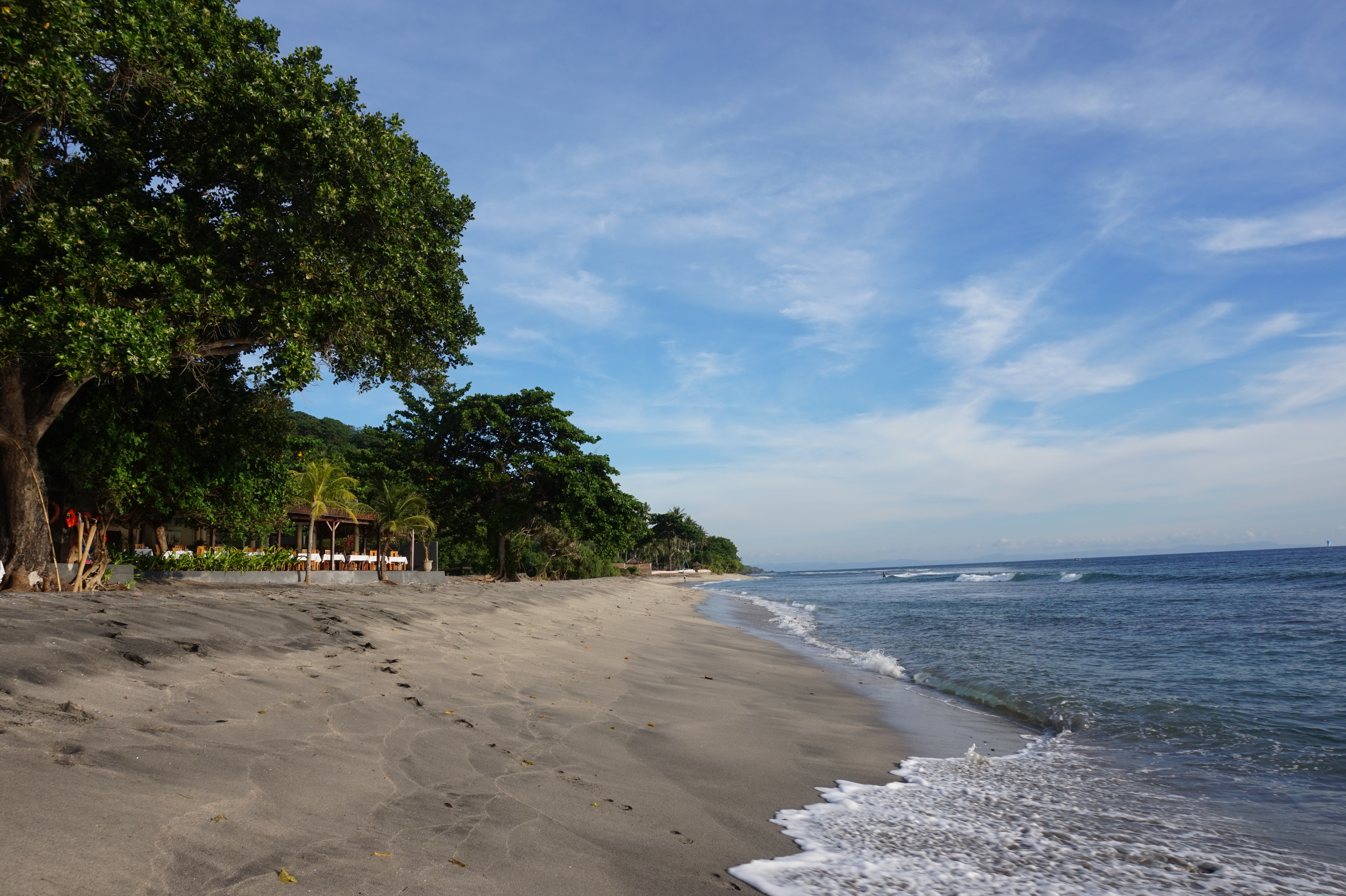 Unser Hotel begrüßte uns direkt am wunderschönen schwarzen Senggigi Beach. Eine sehr gepflegte, große Anlage mit Bungalows und Outdoorbadezimmern. Zum Glück befand sich auch ein hoteleigenes Restaurant und ein großer Infinitypool in Strandlage, denn dies mussten wir mehr nutzen als geplant.